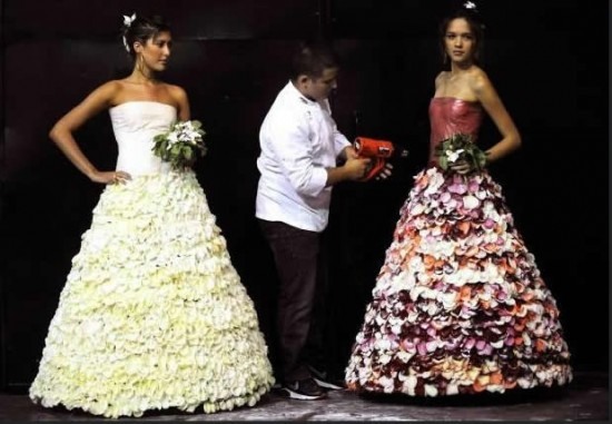 И, вот, талантливый колумбийский шеф-повар создал платья, основу которых составляли 2000 лепестков роз в сахарной глазури. Не забыл творец и об аксессуарах: браслеты, ожерелья, кольца из конфет, - все съедобное. Даже букеты невесты можно с аппетитом съесть, в случае крайней необходимости.