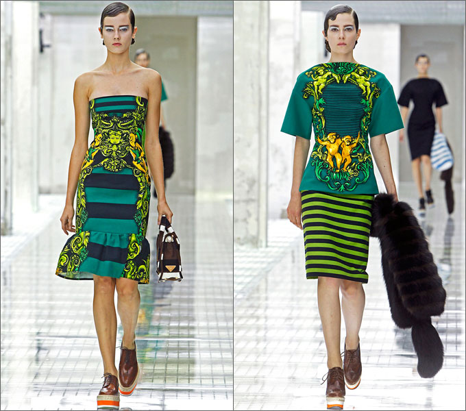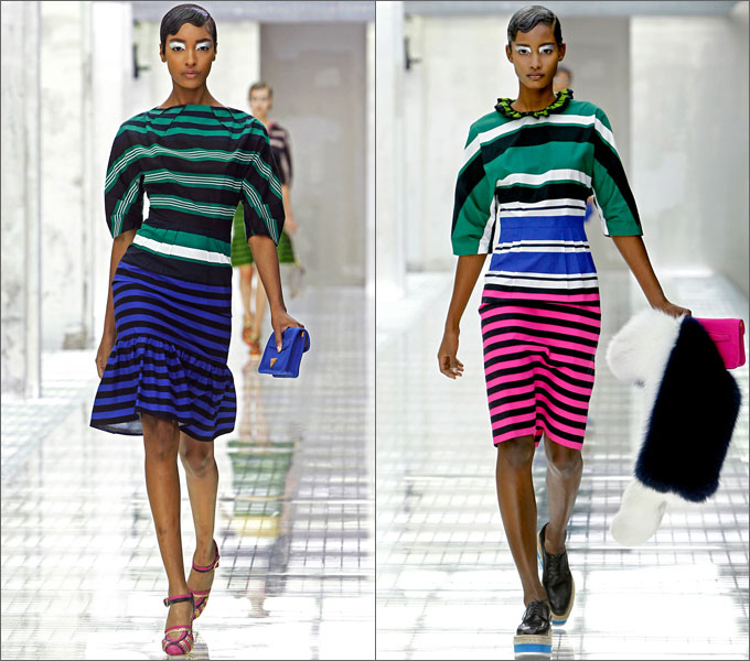 Следующие наряды, представленные на показе, другой направленности: кричащие сочные краски на одежде, напоминающей униформу. Образы дополняли модели в полоску.