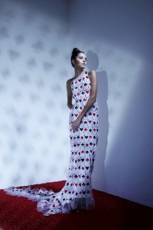 Яркие и жизнерадостные образы коллекции «Playinꞌ Cards» вселяют оптимизм, наполняют юмором, такие платья хочется обязательно примерить. Все материалы коллекции уникальны, созданы методом шелкографии вручную. Контраст белых и черных шахматных конфигураций дополняется и оживляется красным (платья-мини, длинные платья и даже мужские рубашки и бриджи можно встретить в коллекции).