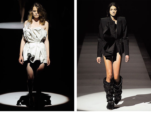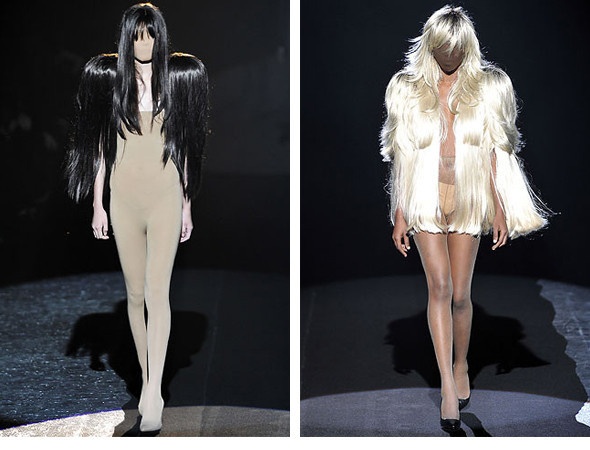 Если говорить об одежде, выпускаемой маркой, то вместе со сложностью кроя и большого внимания к деталям, выделяются такие нестандартные образы, как платье из накладных ресниц, жилет из битого стекла, представленные в коллекции Artisanal.