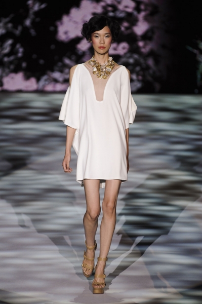 Отличительная особенность новой коллекции – это изысканность: вечерние платья и наряды выполнены из шелка и парчи, ткани отличаются легкостью и полупрозрачностью, украшали наряды обильные браслеты, так же аксессуары, декорированные кристаллами и бисером.