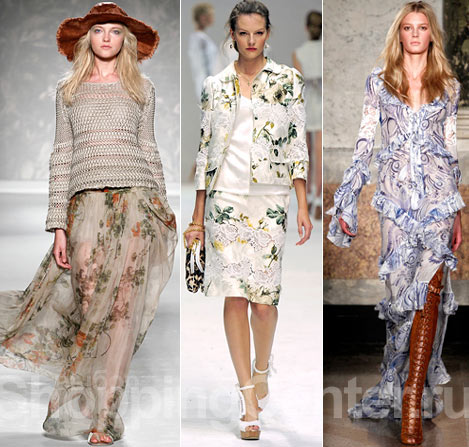 Настроение весны. Поднять его можно, примеряя различные платья с оборками, юбки с цветами и воланами. Примером служит романтическое и женственное длинное платье от EmilioPucci в комплекте с жесткими ботфортами (основа – сочетание противоположностей).