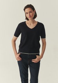 Удобные и практичные свитеры с v-образным вырезом станут незаменимым элементом гардероба: в них вам всегда будет удобно и тепло, какая бы погода не была сейчас на дворе. Хороший пуловер V-neck можно сочетать со строгими брюками, модными джинсами или даже короткой юбкой. Слишком глубокий вырез можно закрыть белой рубашкой или футболкой с круглым вырезом, иногда с джемпером или кардиганом может выгодно сочетаться тонкая водолазка с высоким воротником. Что касается обуви, то тут все на ваш вкус - от легких босоножек да сапогов на каблуке!